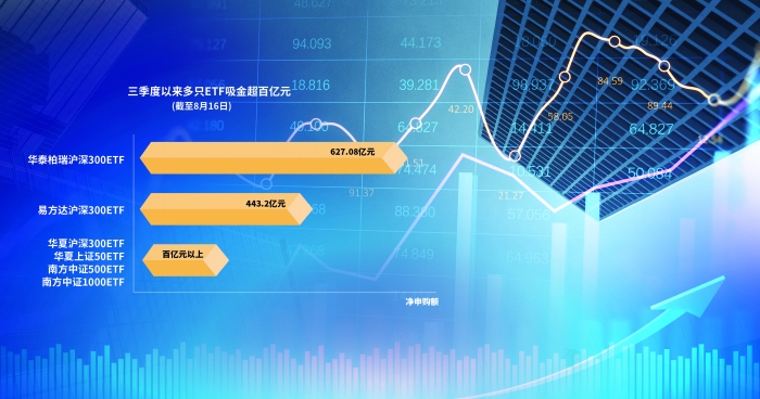 ETF已成为市场重要增量资金来源。进入三季度以来,截至8月16日,短短一个多月时间,多只ETF吸金超百亿元。例如,华泰柏瑞沪深300ETF净申购额为627.08亿元,易方达沪深300ETF净申购额为443.2亿元,华夏沪深300ETF、华夏上证50ETF、南方中证500ETF、南方中证1000ETF净申购额均在百亿元以上。