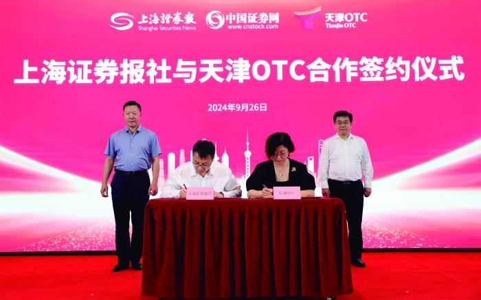 9月26日,天津市工商联津榜之旅培训暨上海证券报社与天津OTC合作签约仪式在上海中国金融信息中心举行。仪式现场,在上海证券报社党委书记、董事长叶国标和天津市工商联专职副主席于为忠共同见证下,上海证券报社与天津OTC双方正式签约,达成合作。