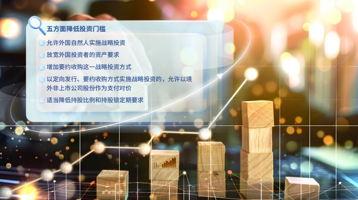 修订后的《办法》主要从五方面降低了投资门槛,旨在进一步拓宽外资投资证券市场渠道,发挥战略投资渠道引资潜力,鼓励外资开展长期投资、价值投资。