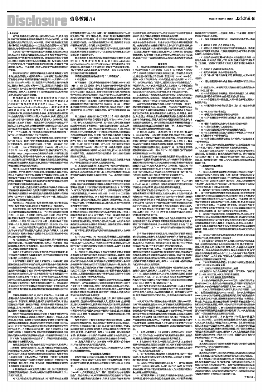 7、发行人和保荐人(主承销商)将在2024年11月21日(T-1日)《发行公告》中披露网下投资者的报价情况、发行价格、最终发行数量和有效报价投资者的名单等信息。