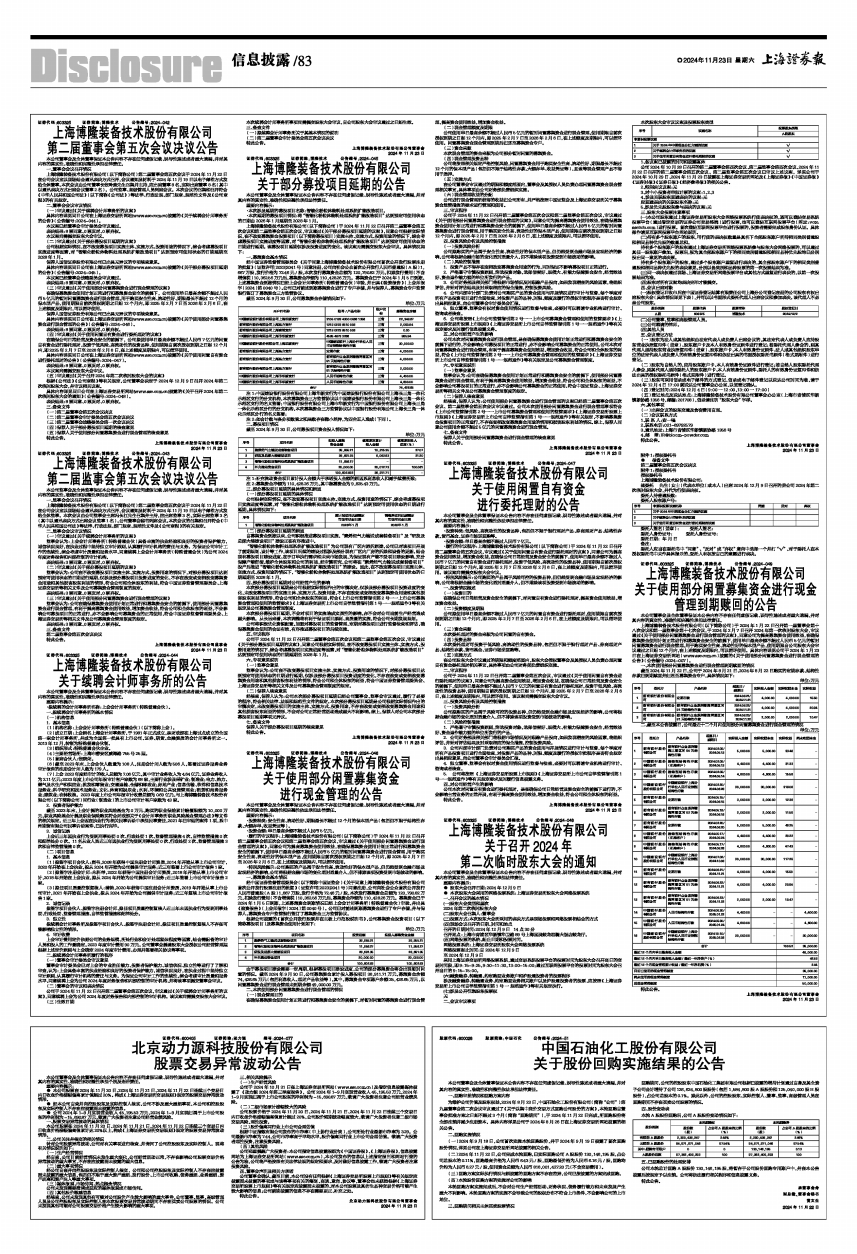 上海博隆装备技术股份有限公司(以下简称公司)于2024年11月22日召开第二届董事会第五次会议和第二届监事会第五次会议,审议通过《关于部分募投项目延期的议案》,同意公司根据实际情况,在不改变募集资金投资项目(以下简称募投项目)实施主体、实施方式、投资用途的情况下,综合考虑募投项目实施进度等因素,对“智能化粉粒体物料处理系统扩能改造项目”达到预定可使用状态的日期进行延期。该募投项目延期仅涉及投资进度的变化。该议案无需提交股东大会审议。具体情况如下: