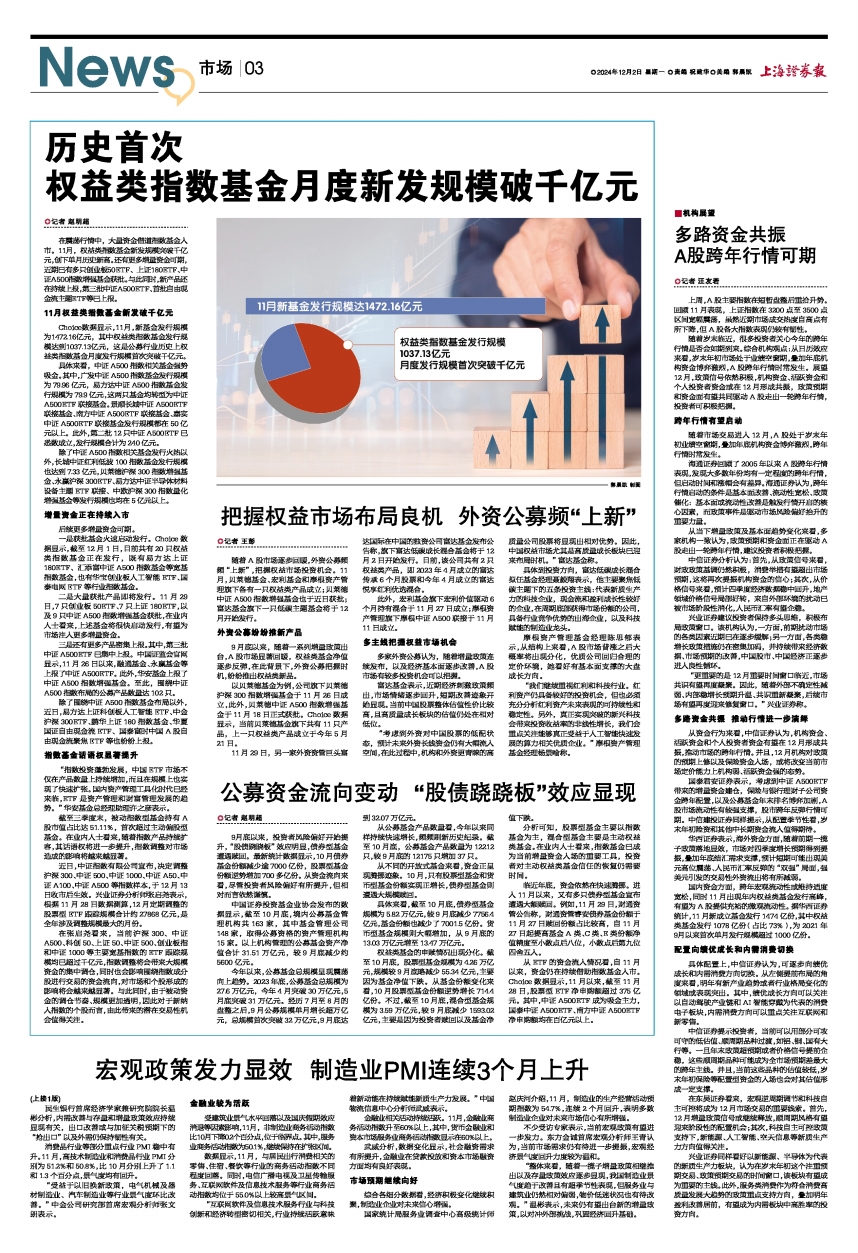 在震荡行情中,大量资金借道指数基金入市。11月,权益类指数基金新发规模突破千亿元,创下单月历史新高。还有更多增量资金可期,近期已有多只创业板50ETF、上证180ETF、中证A500指数增强基金获批。与此同时,新产品还在持续上报,第三批中证A500ETF、首批自由现金流主题ETF等已上报。
