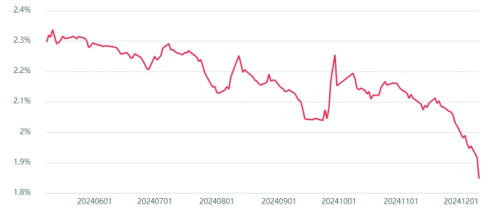 截至12月10日收盘,10年期国债收益率下行6.5个基点报1.84%,续创历史新低;30年期国债收益率下行5.5个基点报2.055%。