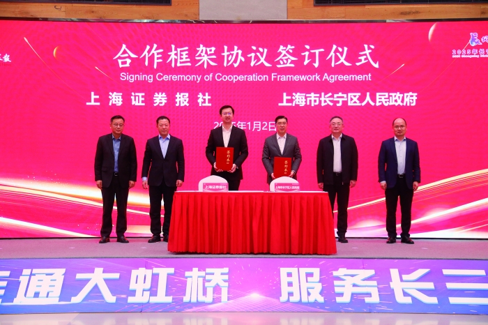 会议现场,在上海市长宁区委书记张伟,上海市长宁区委副书记、代区长刘平,上海证券报社党委书记、董事长叶国标,上海证券报社刘冬赋的见证下,上海市长宁区副区长赵永尊和上海证券报社董事、党委常委、副总编辑齐劼人代表双方正式签约。