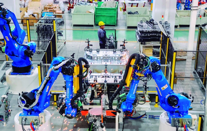 1月3日,在江苏省江都高新技术产业开发区扬州市洪泉实业有限公司智能生产车间,工业机器人在生产线上作业。新年伊始,各地企业开足马力赶订单、忙生产,力争“开门红”。 新华社图
