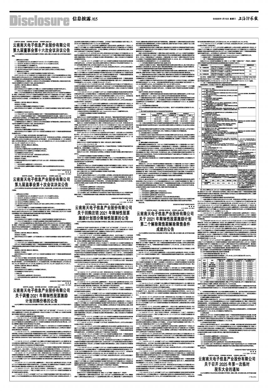 云南南天电子信息产业股份有限公司(以下简称“公司”或“南天信息”)于2025年1月14日召开第九届董事会第十六次会议、第九届监事会第十次会议审议通过了《关于回购注销2021年限制性股票激励计划部分限制性股票的议案》,尚需提交公司股东大会审议,具体情况如下: