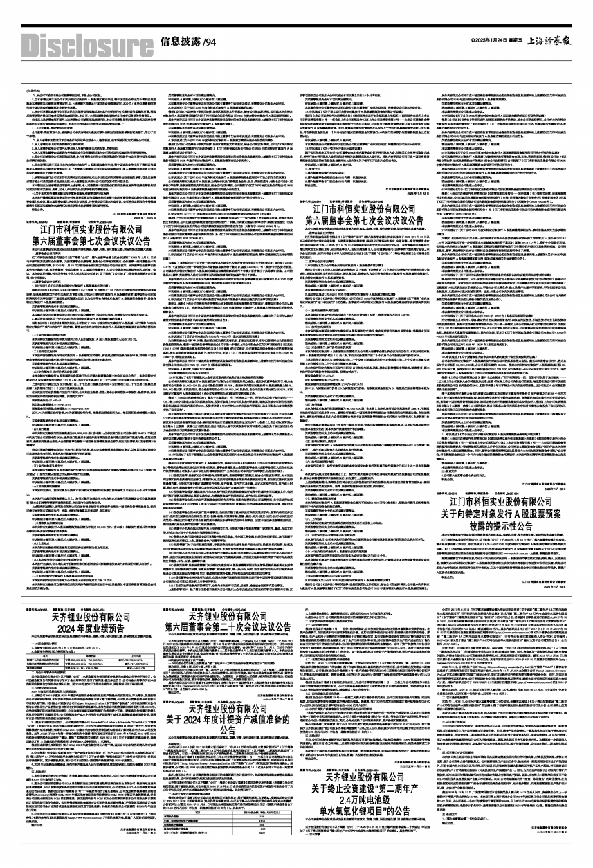 天齐锂业股份有限公司(以下简称“公司”)于2025年1月23日召开第六届董事会第二十次会议,审议通过了《关于终止投资建设“第二期年产2.4万吨电池级单水氢氧化锂项目”的议案》。具体情况如下: