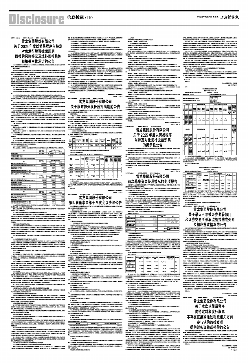 具体内容详见2025年1月24日于上海证券交易所网站(www.sse.com.cn)及指定媒体披露的《雪龙集团股份有限公司2025年度以简易程序向特定对象发行股票预案》。