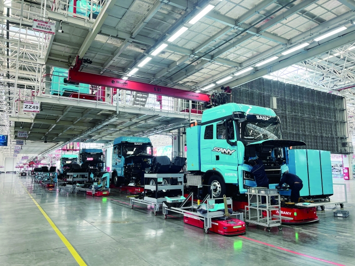 记者在三一重卡智能制造车间看到,200多台机器人与工人一起紧张地忙碌着,超过700台AGV(自动导引车)有序地穿梭;在发货场,等待发货的新能源重卡整齐排列,不同涂装色彩的重卡中有不少将发往海外。