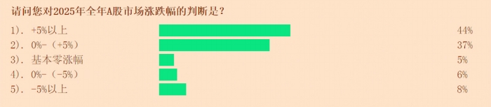 展望A股2025年全年走势,81%的投顾表示看涨,较上季度调查上升4个百分点。其中,44%的投顾认为大盘涨幅在5%以上,较上季度上升8个百分点;认为大盘会下跌的投顾占比不到两成。