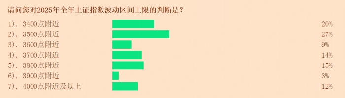 对于今年上证综指波动区间的下限,34%的投顾选择在3200点附近,38%的投顾选择在3100点附近。而在2024年同期,63%的投顾预测指数的运行下限在3000点附近;25%的投顾选择在3100点附近。