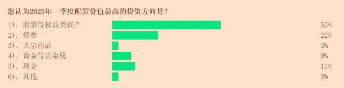 在本次调查中,对2025年一季度宏观经济形势预期持“中性”和“乐观”态度的投顾合计占比为58%,较2024年四季度上升5个百分点。