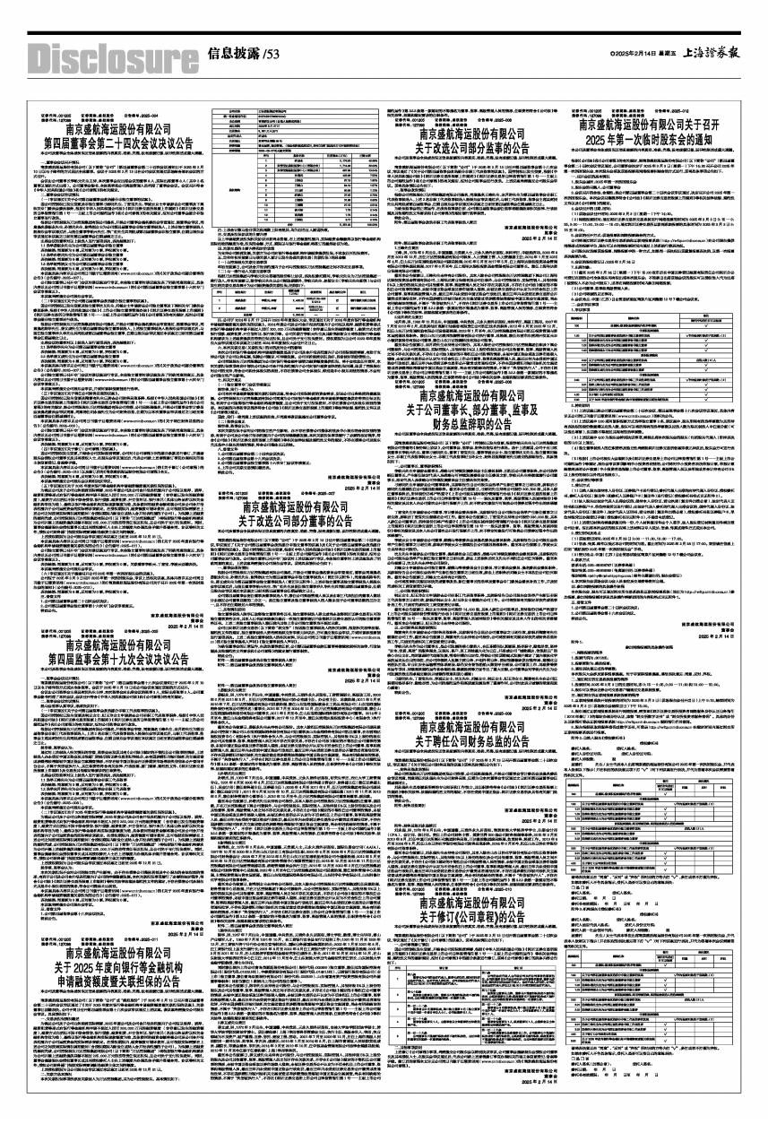 南京盛航海运股份有限公司(以下简称“公司”)第四届董事会第二十四次会议通知已于2025年2月10日以电子邮件的方式送达全体董事。会议于2025年2月13日在公司会议室通过现场结合通讯会议的方式召开。