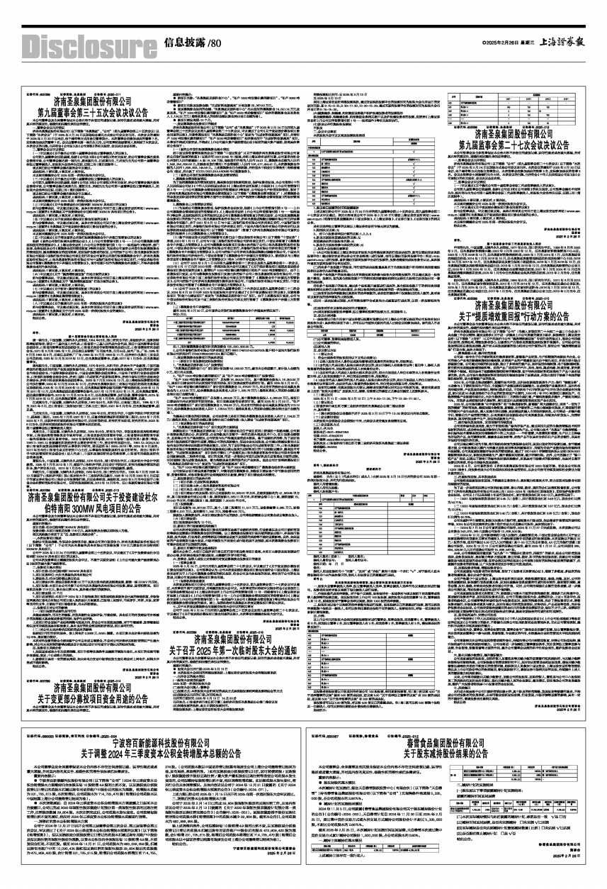 济南圣泉集团股份有限公司(以下简称 “公司”)第九届监事会第二十七次会议(以下简称“本次会议”)于2025年2月24日以现场方式在公司会议室召开。本次会议的通知于2025年2月20日以电话、电子邮件等方式向各位监事发出。本次监事会应参加表决的监事3名,实际参加表决的监事3名。会议由监事会主席陈德行先生主持。本次会议的召集、召开符合《中华人民共和国公司法》及《公司章程》的有关规定,会议决议合法有效。