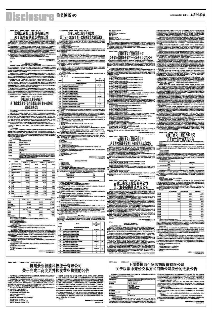 安徽江南化工股份有限公司(以下简称“公司”)第六届董事会任期已届满,为顺利完成董事会换届选举,根据《公司法》《公司章程》和《董事会议事规则》等有关规定,公司于2025年2月28日召开的第六届董事会第三十七次会议审议通过了《关于董事会换届选举第七届董事会非独立董事的议案》和《关于董事会换届选举第七届董事会独立董事的议案》。