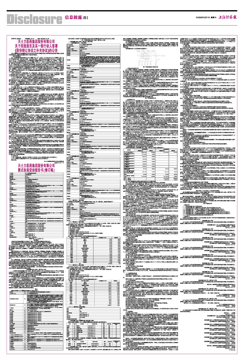 2025年2月27日,公司控股股东天士力集团及天津和悦科技发展合伙企业(有限合伙)、天津康顺科技发展合伙企业(有限合伙)、天津鸿勋科技发展合伙企业(有限合伙)、天津通明科技发展合伙企业(有限合伙)、天津顺祺科技发展合伙企业(有限合伙)、天津善臻科技发展合伙企业(有限合伙)(以上主体统称“天士力集团及其一致行动人”)与华润三九签署了《股份转让协议之补充协议》,对《股份转让协议》中的部分条款进行变更或进行补充约定,主要内容如下: