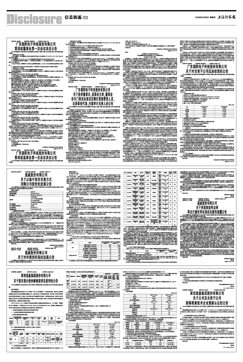 广东朝阳电子科技股份有限公司(以下简称“公司”)于2025年3月4日召开了第四届董事会第一次会议和第四届监事会第一次会议,审议通过了关于选举公司第四届董事会董事长、第四届监事会主席、第四届董事会各专门委员会委员及聘任公司高级管理人员、证券事务代表和内部审计负责人等相关议案,现将相关情况公告如下: