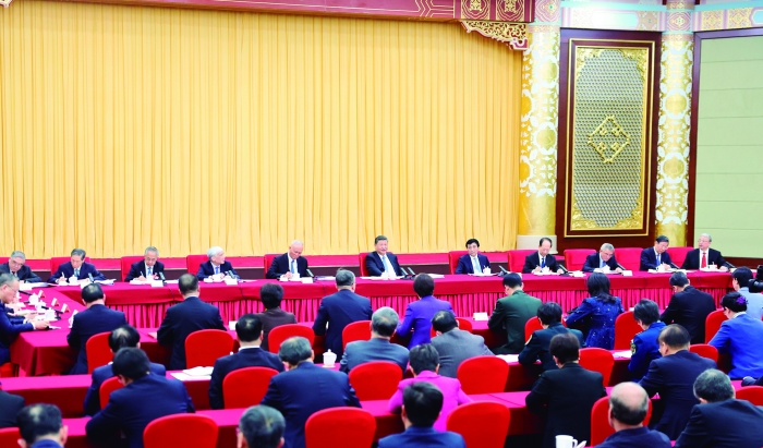 中共中央政治局常委、全国政协主席王沪宁,中共中央政治局常委、中央办公厅主任蔡奇参加看望和讨论。