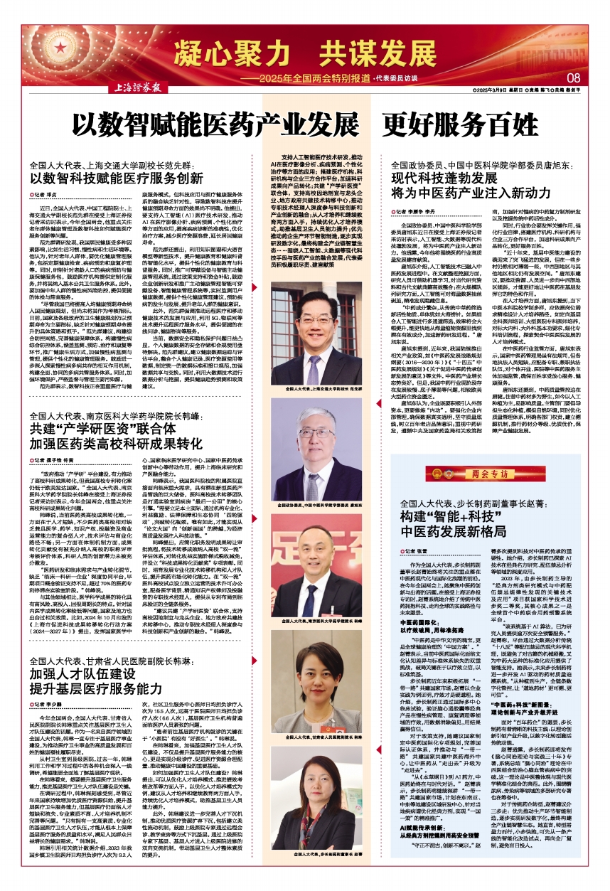 支持人工智能医疗技术研发,推动AI在医疗影像分析、疾病预测、个性化治疗等方面的应用;搭建医疗机构、科研机构与企业三方合作平台,加速科研成果向产品转化;共建“产学研医资”联合体,支持高校因地制宜与龙头企业、地方政府共建技术转移中心,推动专职技术经理人深度参与科技创新和产业创新的融合;从人才培养和继续教育两方面入手,持续优化人才培养模式,助推基层卫生人员能力提升;优先推动药企生产环节智能制造,逐步实现研发数字化,最终构建全产业链智慧生态……围绕人工智能、大数据等现代科技手段与医药产业的融合发展,代表委员积极履职尽责、建言献策