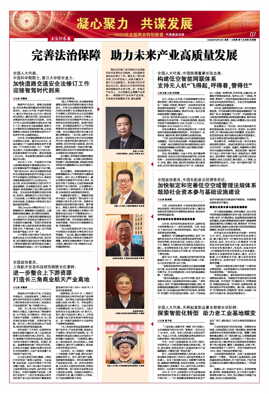 建议相关部门及时跟进自动驾驶的技术进展和应用趋势,加快道路交通安全法修订工作;建议长三角加强协同,加大研发投入,突破关键技术,提升自主创新能力,推动航天技术的商业化应用;建议加大对低空经济基础设施建设的支持力度;进一步强化产业导入,充分挖掘央企增量产业资源……围绕新兴产业未来产业发展,代表委员积极履职尽责、建言献策