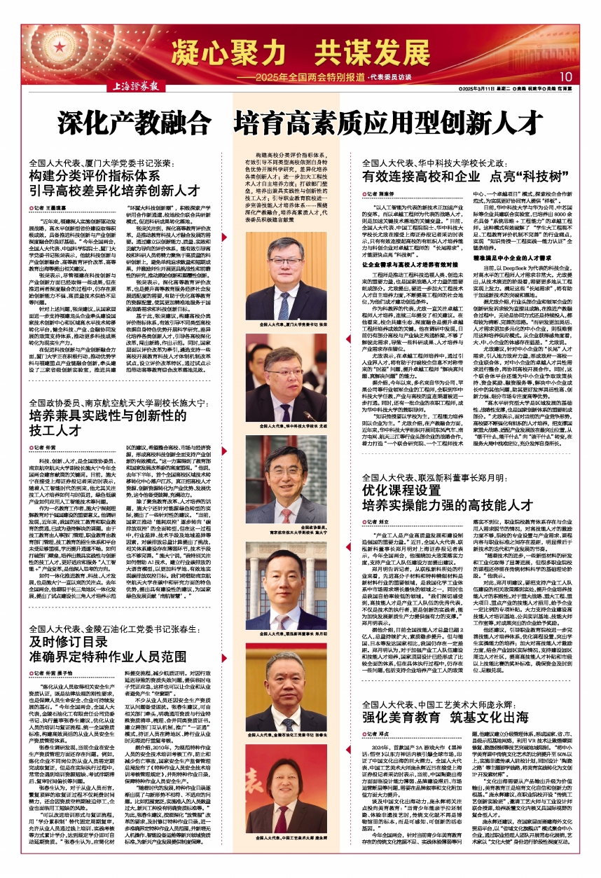 构建高校分类评价指标体系,有效引导不同类型高校依据自身特色优势开展科学研究,差异化培养各类创新人才;进一步加大工程技术人才自主培养力度;打破部门壁垒,培养出兼具实践性与创新性的技工人才;引导职业教育院校进一步完善技能人才培养体系……围绕深化产教融合,培养高素质人才,代表委员积极建言献策