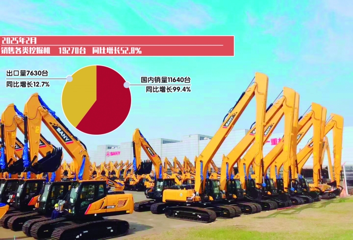 据中国工程机械工业协会对挖掘机主要制造企业统计,2025年2月销售各类挖掘机19270台,同比增长52.8%。其中国内销量11640台,同比增长99.4%;出口7630台,同比增长12.7%。
