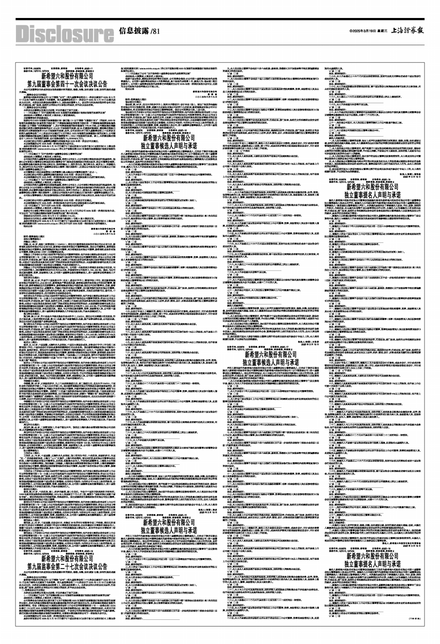 声明人谢佳扬作为新希望六和股份有限公司第十届董事会独立董事候选人,已充分了解并同意由提名人新希望六和股份有限公司董事会提名为新希望六和股份有限公司(以下简称该公司)第十届董事会独立董事候选人。现公开声明和保证,本人与该公司之间不存在任何影响本人独立性的关系,且符合相关法律、行政法规、部门规章、规范性文件和深圳证券交易所业务规则对独立董事候选人任职资格及独立性的要求,具体声明并承诺如下事项: