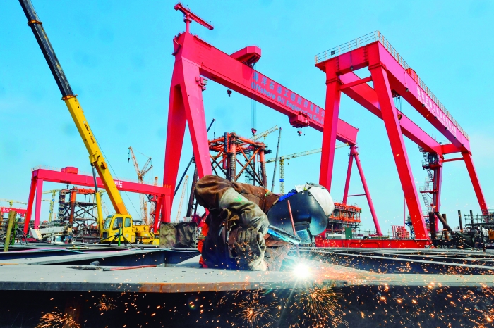 3月30日,工人在海油工程天津智能化制造基地进行渤海油田平台钢材预制作业。