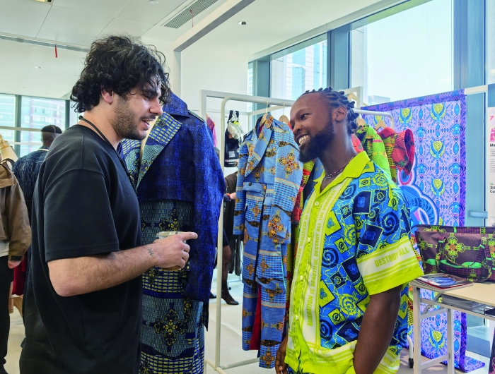 ②2025秋冬上海时装周的MODE上海服装服饰展上,法国百货公司巴黎春天男装部资深买手Raphael Deray在非洲品牌Masa Mara展位前与相关负责人交流。 记者 曾庆怡 摄