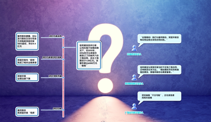 从头梳理事件脉络,在接受记者采访时,佳和建设方面一直强调,公司与普邦股份、深蓝环保没有任何业务往来和合同纠纷,为何会出现在深蓝环保的合作方中?