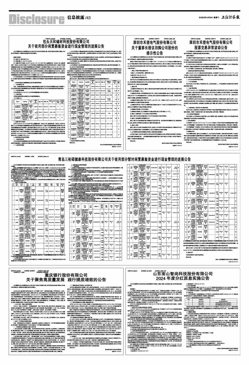 1、山东南山智尚科技股份有限公司(以下简称“公司”)回购专用证券账户中的股份5,369,100股不参与本次权益分派。公司2024年年度权益分派方案为:以公司现有总股本434,705,856股剔除已回购股份5,369,100股后的429,336,756股为基数,向全体股东每10股派发1.50元(含税)人民币现金,实际派发现金分红总额64,400,513.40元(含税)。