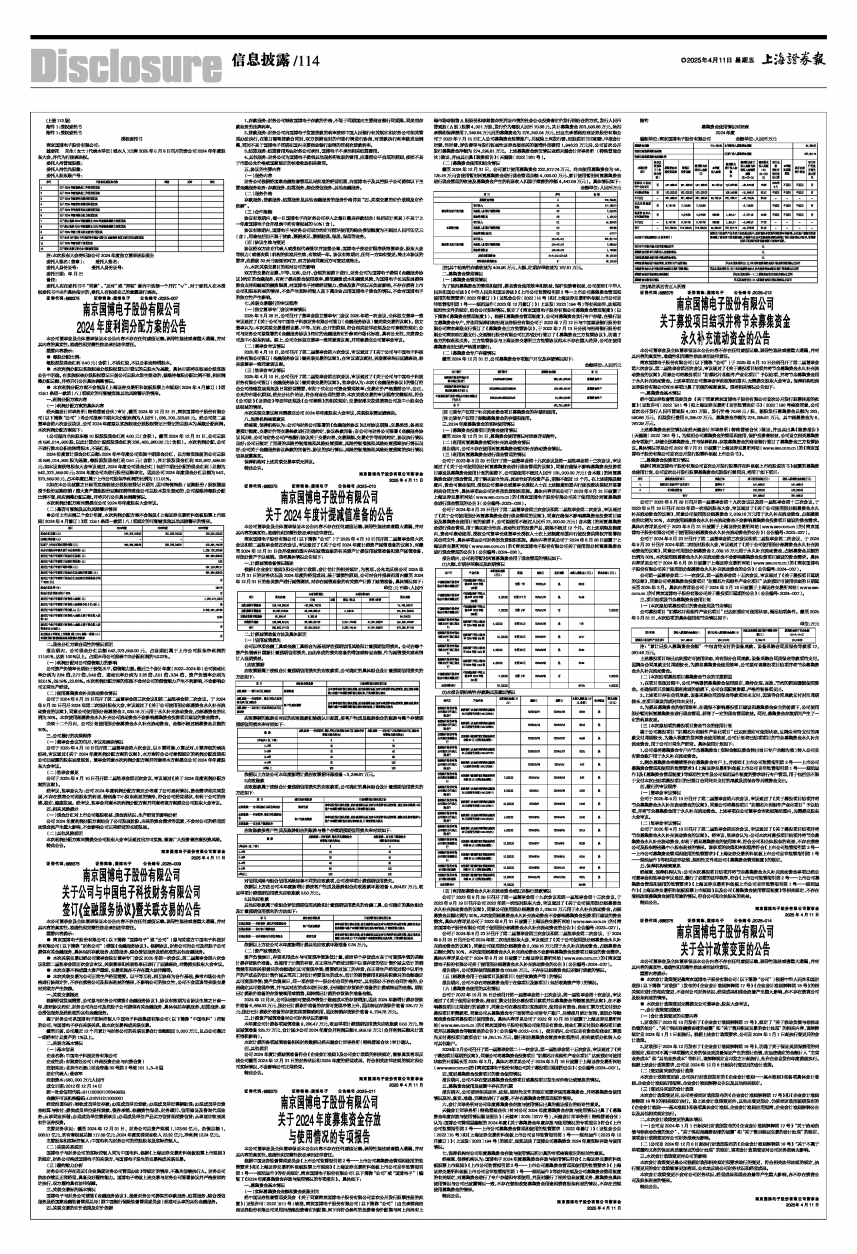 经天健会计师事务所(特殊普通合伙)审计,截至2024年12月31日,南京国博电子股份有限公司(以下简称“公司”)母公司报表中期末未分配利润为人民币1,038,700,323.93元。经公司第二届董事会第六次会议决议,公司2024年度拟以实施权益分派股权登记日登记的总股本为基数分配利润。本次利润分配方案如下: