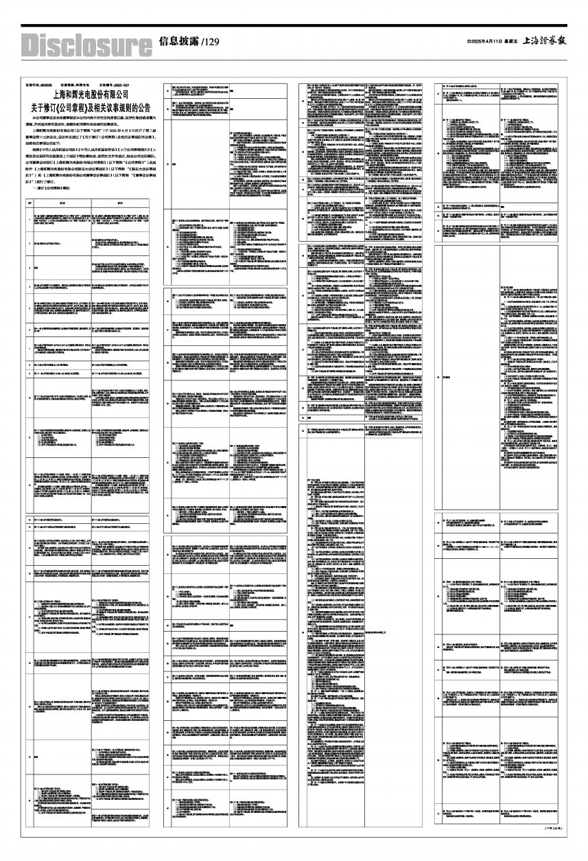 上海和辉光电股份有限公司(以下简称“公司”)于2025年4月9日召开了第二届董事会第十三次会议,会议审议通过了《关于修订〈公司章程〉及相关议事规则的议案》,现将相关事项公告如下: