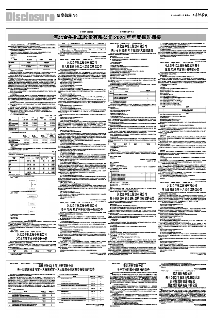 河北金牛化工股份有限公司(以下简称“公司”)根据上海证券交易所《上市公司行业信息披露指引第十八号一一化工》、《关于做好上市公司2024年年度报告披露工作的通知》的要求,现将2024年度主要经营数据披露如下:
