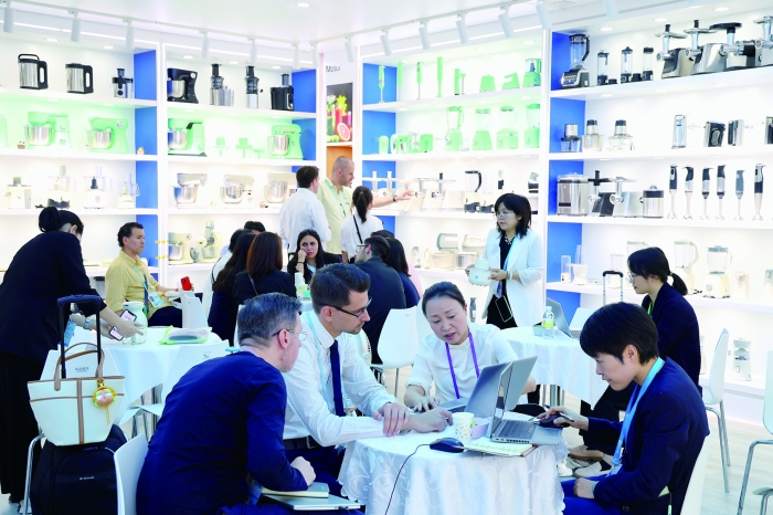 4月15日,客商在一家电器公司的展区洽谈。