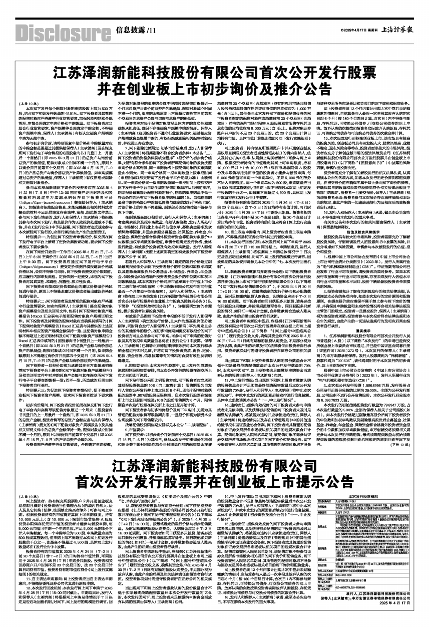 1、江苏泽润新能科技股份有限公司首次公开发行人民币普通股(A股)(以下简称“本次发行”)的申请已经深交所创业板上市委员会审议通过,并已经中国证监会同意注册(证监许可〔2025〕272号)。本次发行的保荐人(主承销商)为申万宏源承销保荐。发行人股票简称为“泽润新能”,股票代码为“301636”,该代码同时用于本次发行的初步询价、网上申购及网下申购。