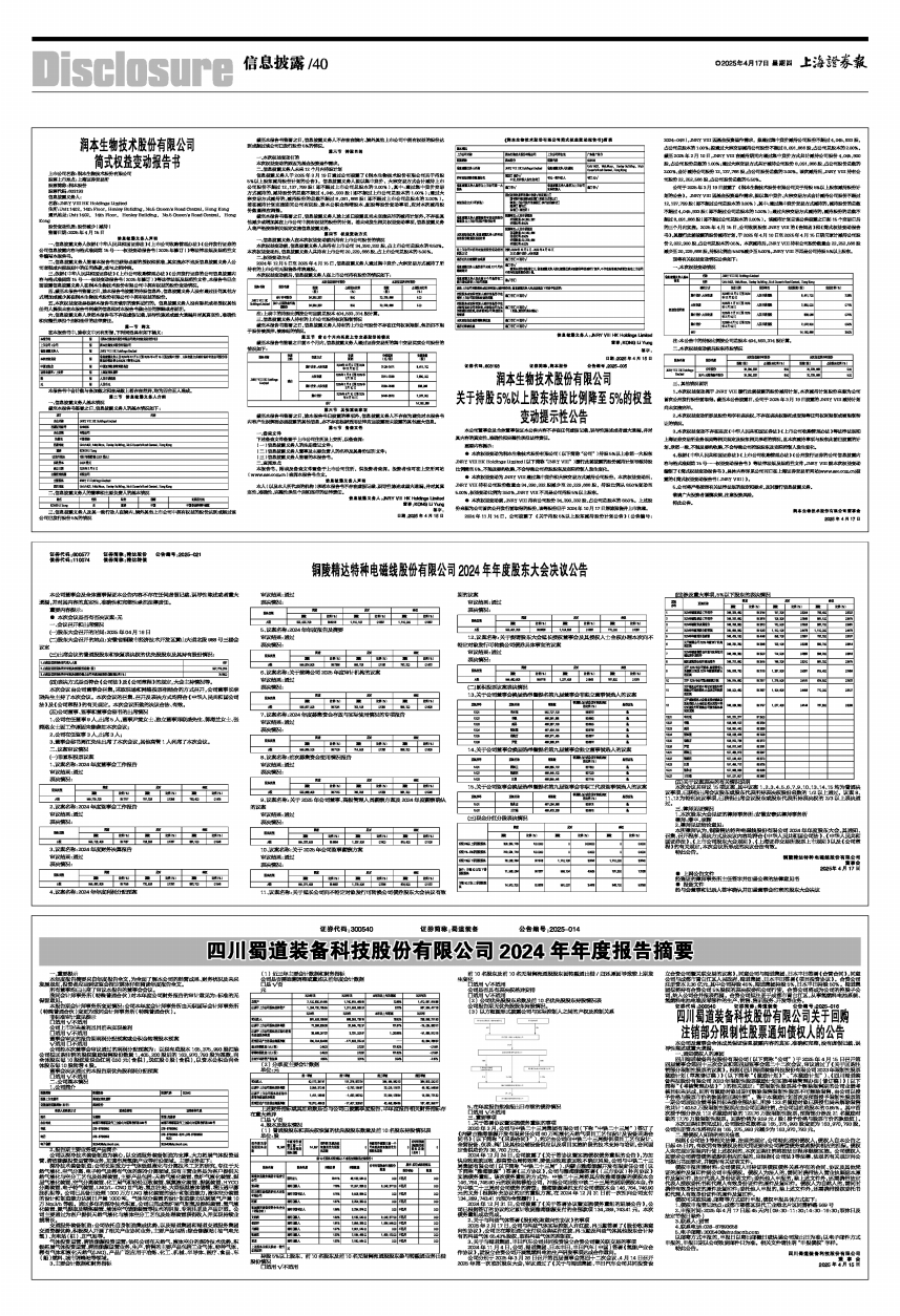 公司于2025年3月19日披露了《润本生物技术股份有限公司关于持股5%以上股东减持股份计划的公告》。JNRY VIII因基金投资运作需求,拟以集中竞价、大宗交易方式合计减持公司股份不超过12,137,799股(即不超过公司总股本的3.00%),其中:通过集中竞价交易方式减持的,减持股份的总数不超过4,045,933股(即不超过公司总股本的1.00%);通过大宗交易方式减持的,减持股份的总数不超过8,091,866股(即不超过公司总股本的2.00%)。该减持计划自该公告披露之日起15个交易日后的三个月内实施。2025年4月15日,公司收到股东JNRY VIII的《告知函》和《简式权益变动报告书》,其履行此前披露的股份减持计划,于2025年4月10日至2025年4月15日期间累计减持公司股份2,022,900股,占公司总股本的0.5%。本次减持后,JNRY VIII持有公司股份数量由22,252,566股减少至20,229,666股,持股比例由5.50%减少至5.00%,JNRY VIII不再是公司持股 5%以上股东。