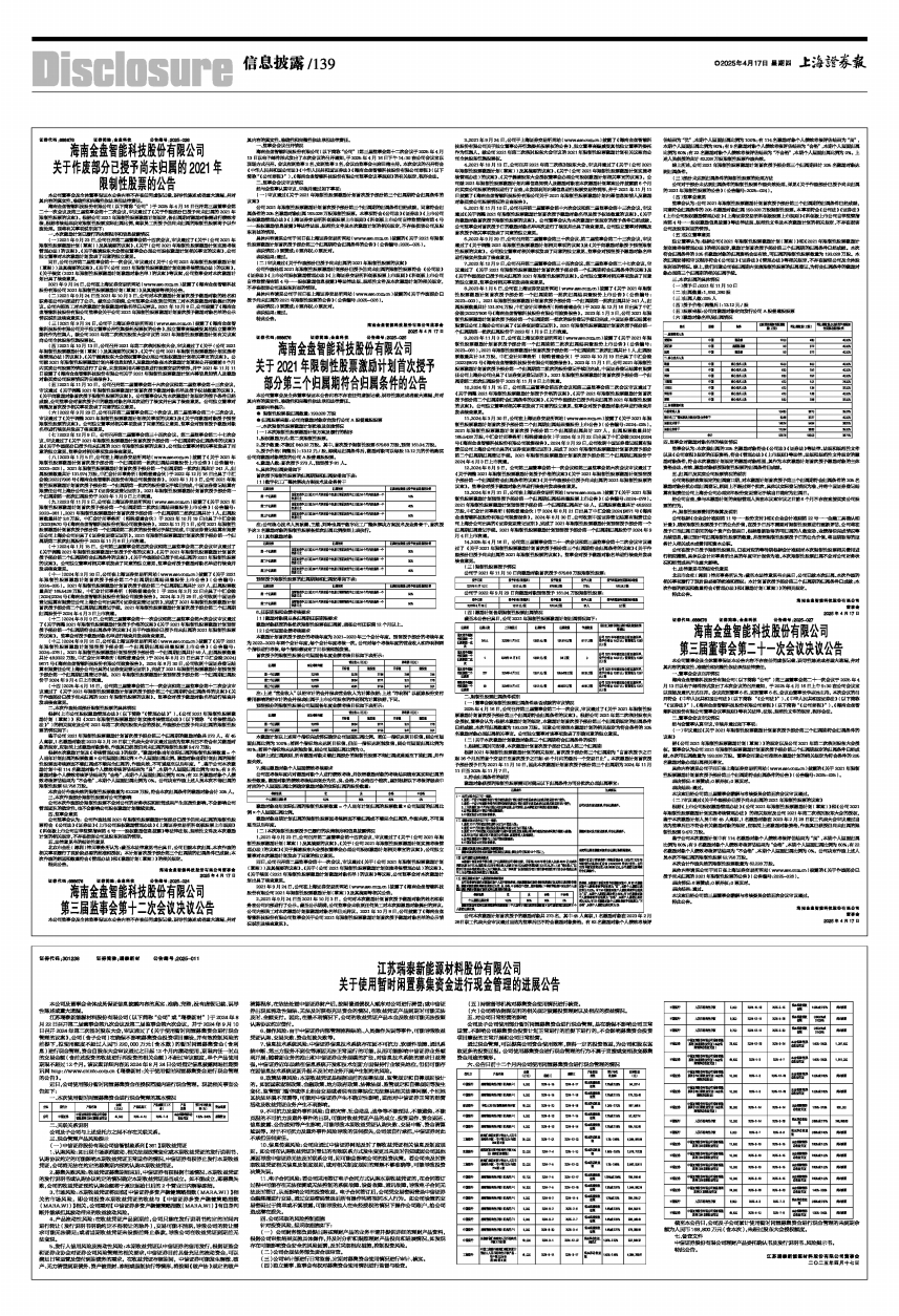 11、2024年3月30日,公司在上海证券交易所网站(www.sse.com.cn)披露了《关于2021年限制性股票激励计划首次授予部分第二个归属期归属结果暨股份上市公告》(公告编号:2024-025)。2021年限制性股票激励计划首次授予部分第二个归属期归属共计227人,归属股票数量共计165.5428万股,中汇会计师事务所(特殊普通合伙)于2024年3月22日出具了中汇会验[2024]2334号《海南金盘智能科技股份有限公司验资报告》。2024年3月29日,公司收到中国证券登记结算有限责任公司上海分公司出具的《证券变更登记证明》,完成了2021年限制性股票激励计划首次授予部分第二个归属期归属登记手续。2021年限制性股票激励计划首次授予部分第二个归属期归属股份于2024年4月3日上市流通。