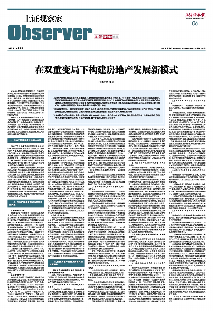 □ 房地产发展新模式是面向高质量发展、可持续发展要求的系统性改革与创新,以“房住不炒”为基本原则,实现行业发展理念和运行机制的根本转变,旨在通过优化资源配置、重塑增长逻辑,推动行业从规模扩张向质量提升转型,从短期逐利向长期价值创造转型,从粗放发展向精细化、专业化、绿色化发展转型,构建市场供需动态平衡、行业运行安全稳健、居住品质持续提升的长效机制。房地产发展新模式涵盖制度模式和企业模式两大维度