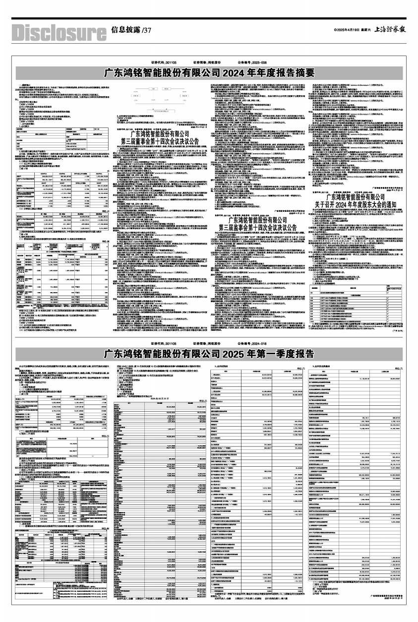 广东鸿铭智能股份有限公司(以下简称“公司”)第三届监事会第十四次会议于2025年4月18日在公司总部九楼会议室以现场及通讯方式召开,本次会议的通知于2025年4月07日以短信、电子邮件、书面等方式发出。本次会议应出席监事3人,实际到会监事3人。本次会议由监事会主席易红先生主持,会议的召集、召开符合法律、行政法规、部门规章和《公司章程》的规定。