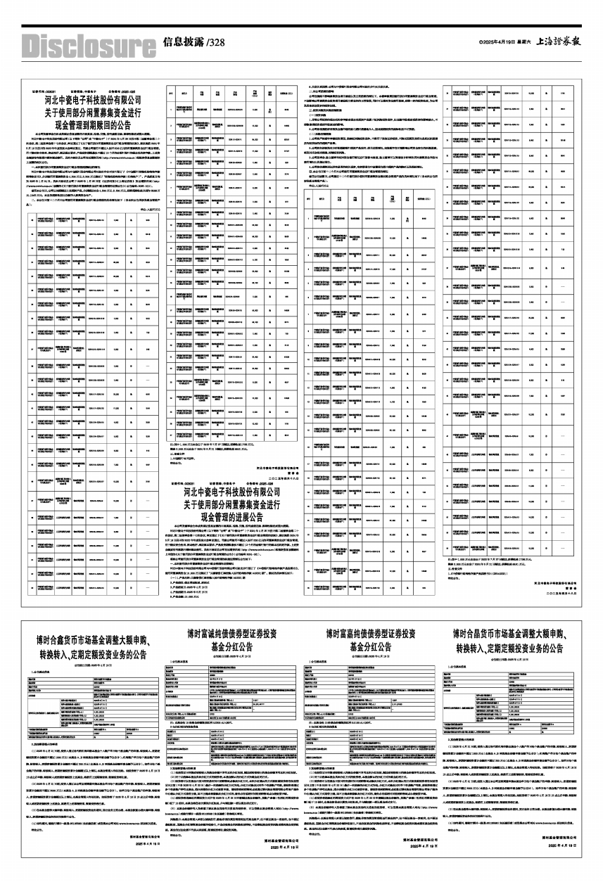 河北中瓷电子科技股份有限公司与中国银行股份有限公司石家庄市合西支行签订了《中国银行挂钩型结构性存款销售协议书》,分别使用闲置募集资金4,500万元、5,500万元购买了“挂钩型结构性存款(机构客户)”。产品起息日均为2025年1月24日。具体内容详见公司于2025年1月25日在《证券时报》《上海证券报》及巨潮资讯网(http://www.cninfo.com.cn)披露的《关于使用部分闲置募集资金进行现金管理的进展公告》(公告编号:2025-010)。