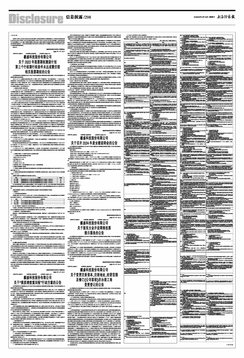 麒盛科技股份有限公司(以下简称“麒盛科技”或“公司”)于2025年4月19日披露关于召开2024年年度股东大会的通知,公司拟于5月12日14:30召开2024年年度股东大会,本次会议采用现场投票和网络投票相结合的表决方式。详见公司披露于上海证券交易所的公告《麒盛科技关于召开2024年年度股东大会的通知》(公告编号:2025-019)。