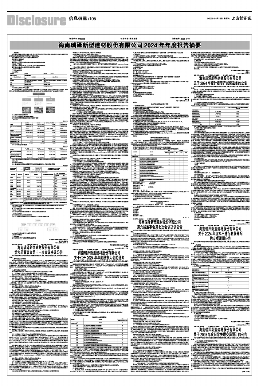 海南瑞泽新型建材股份有限公司2024年年度报告摘要