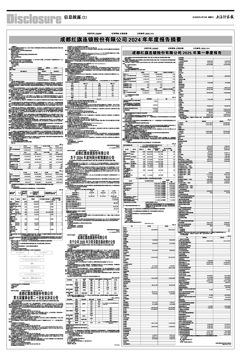 成都红旗连锁股份有限公司(以下简称“公司”)于2025年4月18日召开第五届董事会第二十次会议,审议通过了《2024年度利润分配的预案》,该议案尚需提交公司 2024 年年度股东会审议。现将2024年度利润分配的预案公告如下: