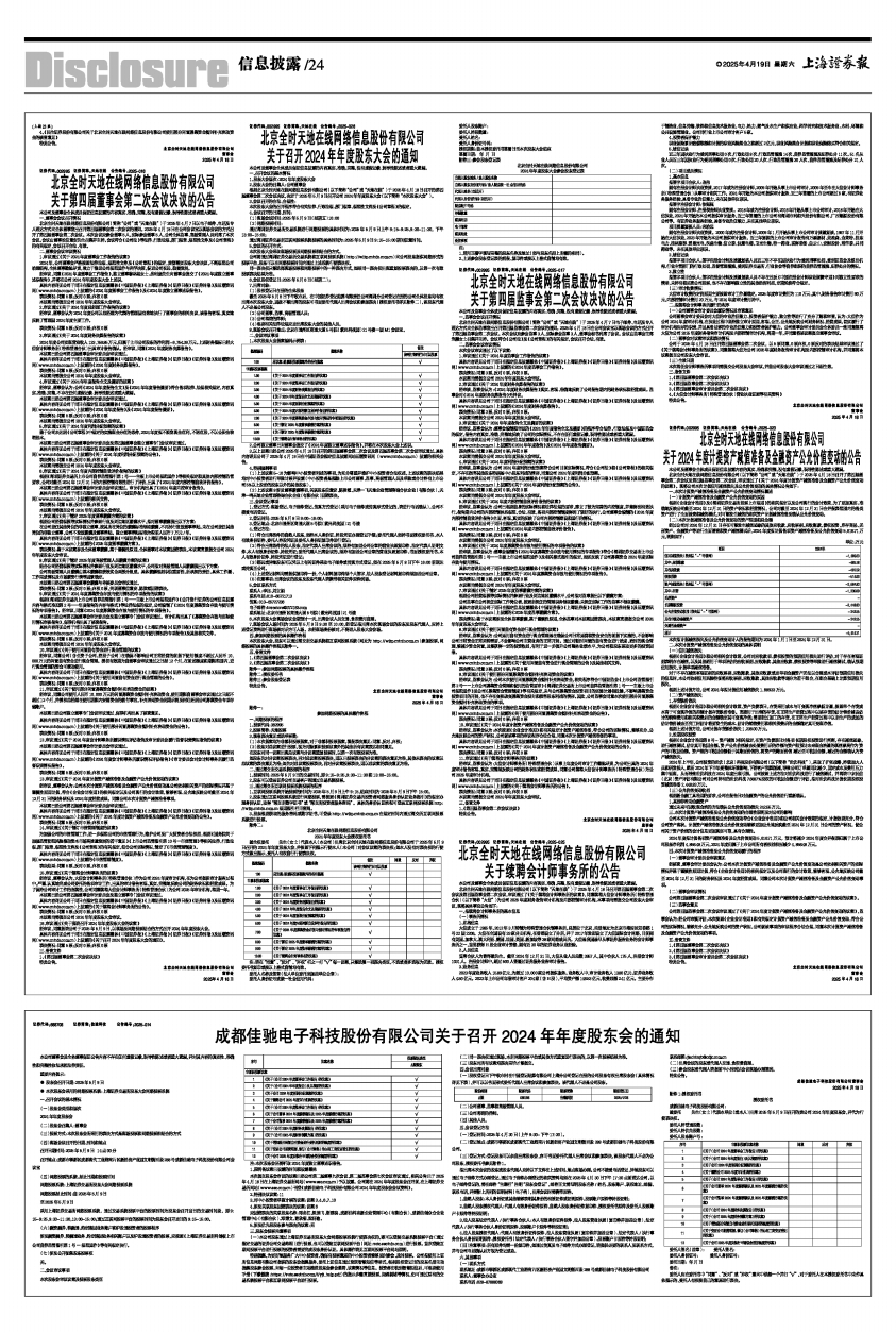 本次提交股东会审议的议案已经公司第二届董事九次会议、第二届监事会第七次会议审议通过,相关公告已于2025年4月18日在上海证券交易所网站(www.sse.com.cn)予以披露。公司将在2024年年度股东会召开前,在上海证券交易所网站(www.sse.com.cn)刊登《成都佳驰电子科技股份有限公司2024年年度股东会会议资料》。