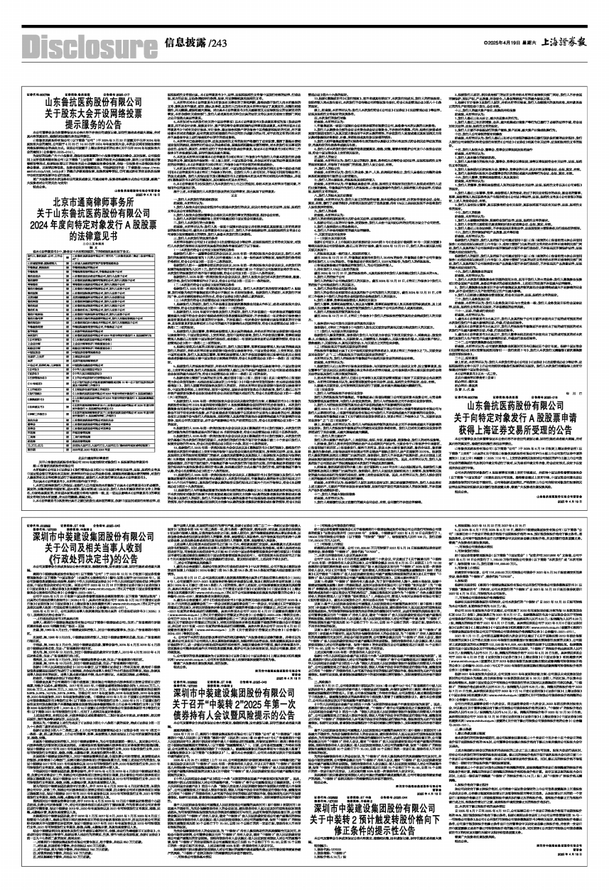 2025年4月25日(星期五)上午10:00,公司将在深圳市罗湖区深南东路4002号鸿隆世纪广场B座四层会议室召开“中装转2”2025年第一次债券持有人会议,审议《关于推选“中装转2”受托管理人并授权参与公司预重整及重整程序(如有)的议案》《关于确定“中装转2”在人民法院裁定受理公司破产重整后转股期限的议案》及《关于确定“中装转2”在人民法院裁定受理公司破产重整后交易期限的议案》。
