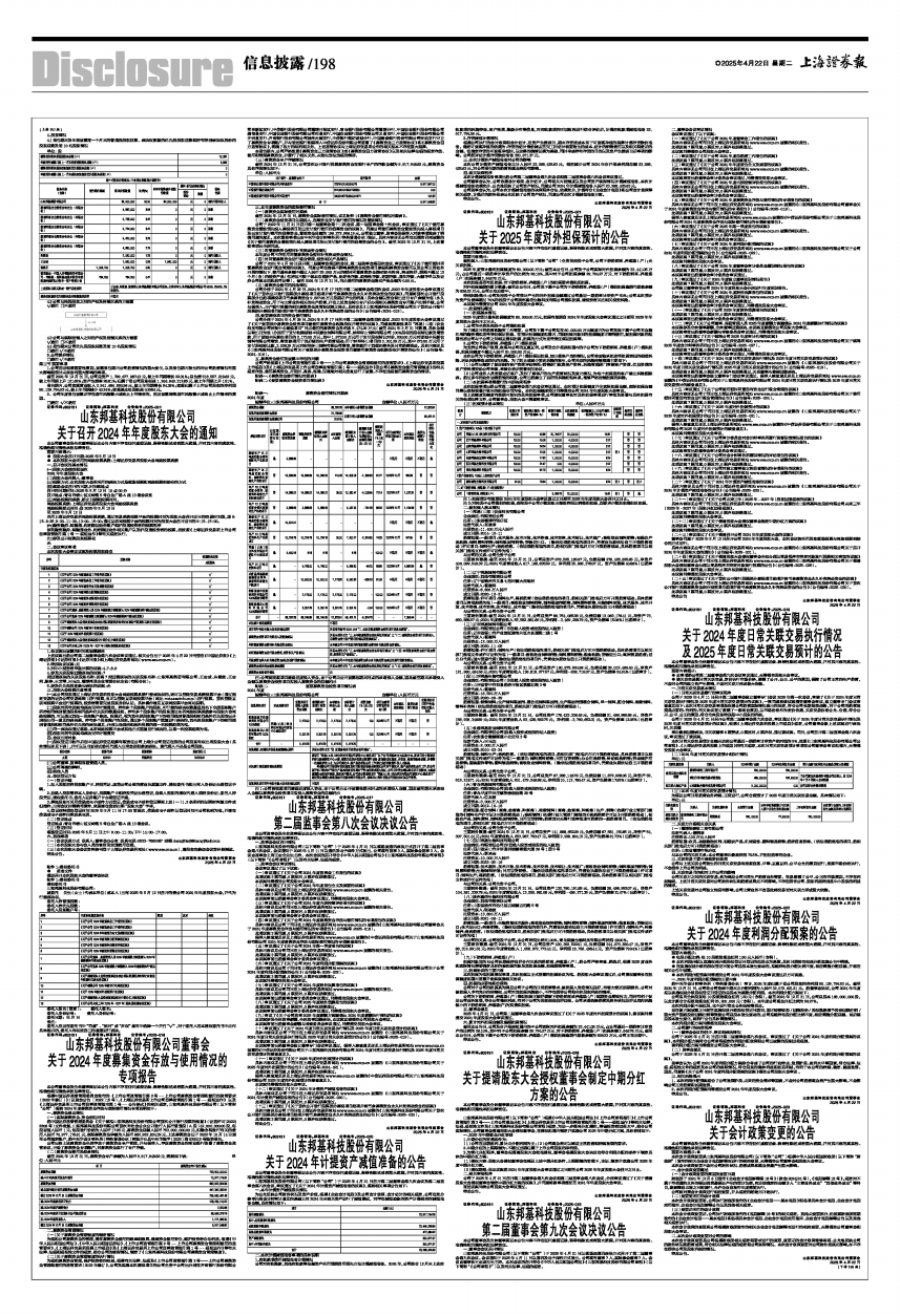 具体内容详见公司于同日在上海证券交易所网站www.sse.com.cn披露的《山东邦基科技股份有限公司关于召开2024年年度股东大会的通知》(公告编号:2025-031)。