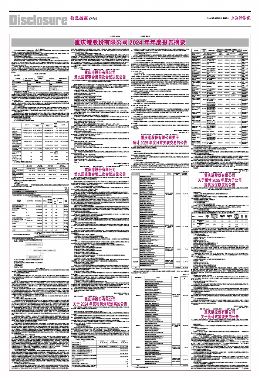 重庆港股份有限公司(以下简称“公司”)于2025年4月18日以现场及通讯表决相结合的方式召开第九届董事会第四次会议,应参加表决的董事9人,实际参加表决的董事9人。本次会议由董事长屈宏先生主持,会议的召集、召开符合《公司法》和本公司《章程》规定。经与会董事认真审议,形成如下决议: