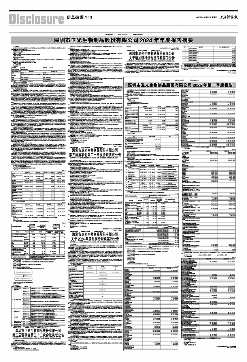 深圳市卫光生物制品股份有限公司(以下简称公司)第三届监事会第二十五次会议于2025年4月21日在公司综合楼三楼会议室以现场结合通讯方式召开,会议应出席监事3名,实际出席监事3名。本次会议由监事会主席邬玉生先生主持,会议的召集、召开和表决程序符合《公司法》和《公司章程》的规定。