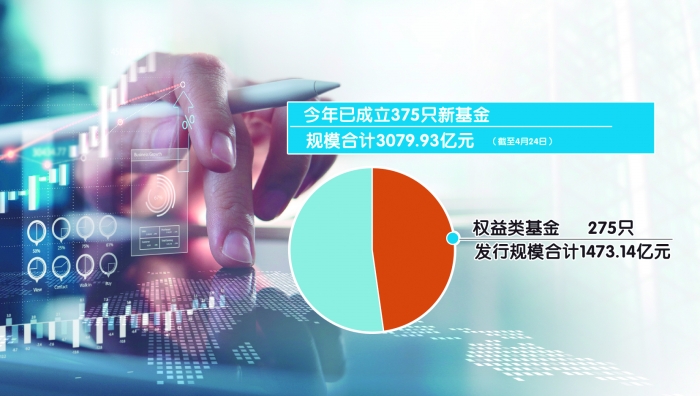 Choice数据显示,截至4月24日,今年以来共成立了375只新基金,发行规模为3079.93亿元。权益类基金成为发行主力,共有275只新基金成立,发行规模合计为1473.14亿元,其中45只发行规模在10亿元以上。